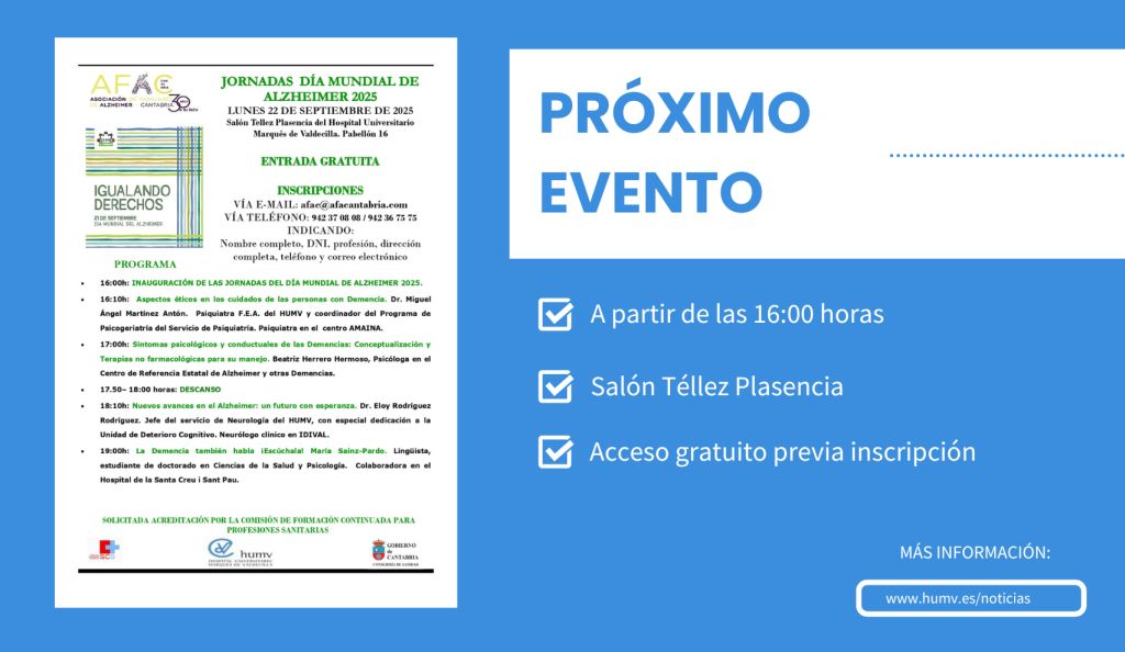 El Hospital Universitario Marqués de Valdecilla (HUMV) acogerá el próximo 22 de septiembre las jornadas con motivo del Día Mundial del Alzheimer organizadas por la Asociación de Familiares de Alzheimer de Cantabria (AFAC). Se trata de una cita dirigida a profesionales sanitarios, así como a todas las personas interesadas en profundizar en los cuidados y avances relacionados con esta enfermedad.
