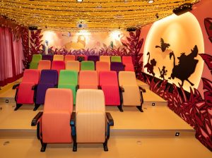 Equipado con la tecnología audiovisual de última generación, este cine forma parte del proyecto ‘En el hospi estoy de cine’, un programa de la Fundación Juegaterapia que permite que los niños ingresados puedan acudir al cine todas las semanas sin salir del hospital. La sala busca ofrecerles momentos de diversión en un entorno especialmente sensible, creando un entorno inmersivo y lleno de color que invita a los pequeños a viajar a otros mundos.