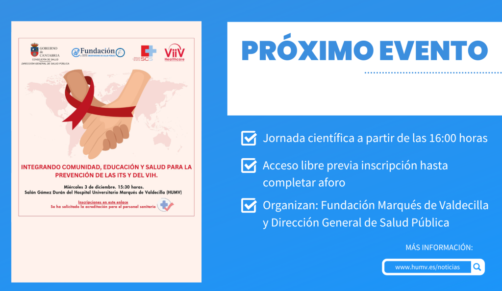 El Hospital Universitario Marqués de Valdecilla (HUMV) acogerá el próximo miércoles, 3 de diciembre, la Jornada ‘Integrando Comunidad, Educación y Salud para la Prevención de las ITS y del VIH’, una cita que pretende ser un punto de encuentro para profesionales sanitarios y ciudadanía interesada en actualizar las evidencias científicas existentes en torno a las Infecciones de Transmisión Sexual (ITS) y el sida.