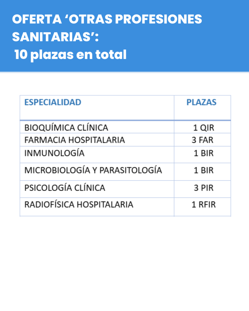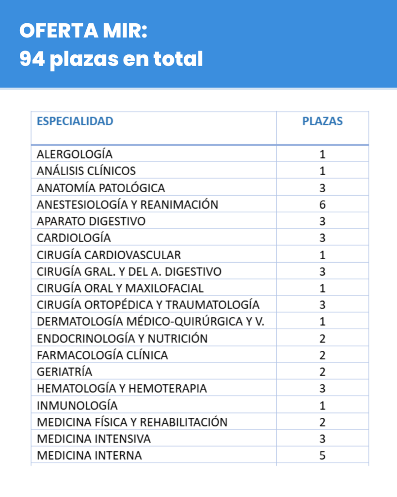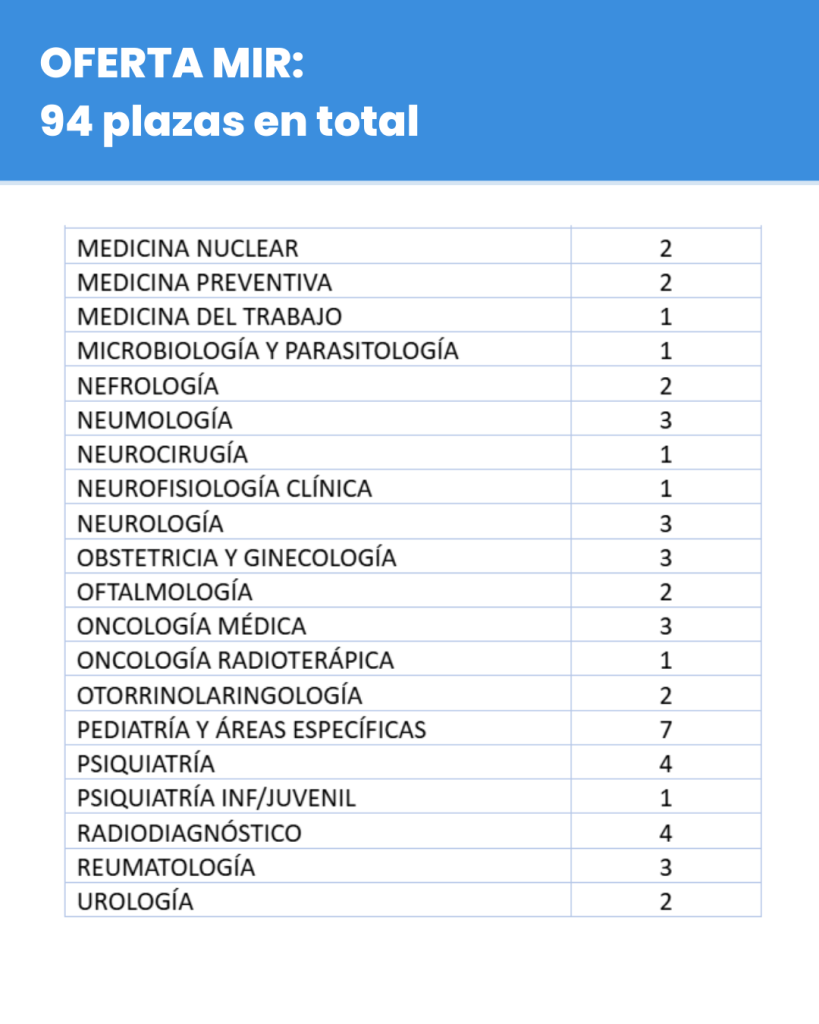La oferta para el próximo año académico es de 119 plazas en 40 especialidades médicas, enfermeras y otras profesionales sanitarias